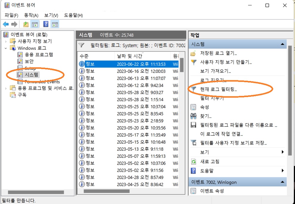 2. '이벤트 뷰어' 좌측의 'Windows 로그'의 하위 메뉴를 열어 '시스템'을 눌러줍니다. 그리고 우측 '현재 로그 필터링'을 눌러줍니다.